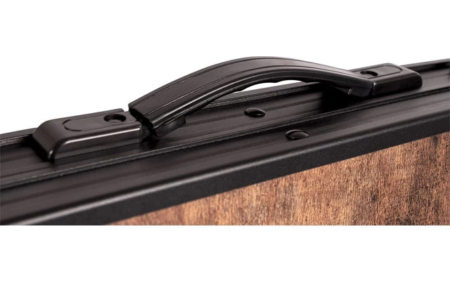 Mit Hilfe von Stellschrauben können die Tischbeine an eine unebene OberflĂ€che angepasst werden. Die Beine sind in 3 verschiedenen Höhen verstellbar (55 cm / 65 cm / 70 cm). DarĂŒber hinaus ist der Tisch durch die abnehmbaren Beine und einer teilbaren Tischplatte sehr kompakt als Koffermodell zu verstauen. AuĂerdem ist der Tisch mit einem Ablagenetz unter der Tischplatte zum Verstauen von GegenstĂ€nden und einem Griff ausgestattet, der das Tragen des Tisches erleichtert.