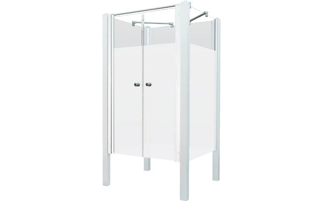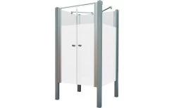 Set bestehend aus: 4 Pfosten, 3 Glaselemente, 1 PendeltĂŒre, 1 Set 45° Stabilisator, 1 90° Stabilisator