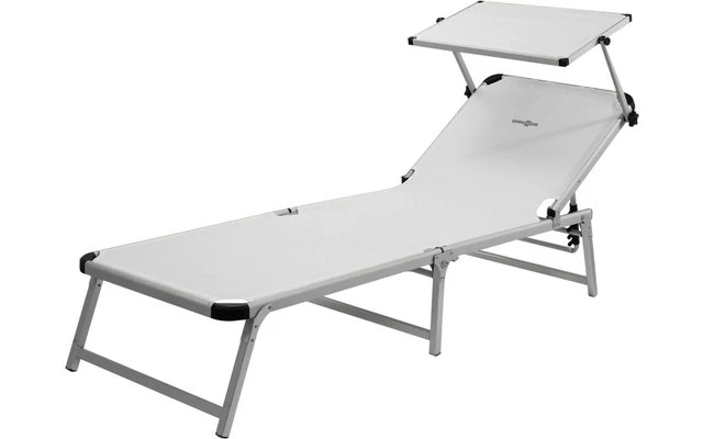 Hochwertige Sonnenliege mit stabilem, klappbarem Dreibeingestell aus eloxiertem Aluminium. Mit verstellbarem Sonnenschutzdach.