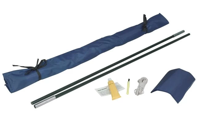 Zelt-Reparaturset bestehend aus: FiberglasgestÀnge, Gummikordel, Zeltstoff und Gewebekleber.
