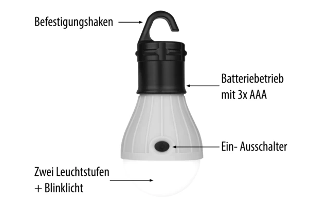 - LED HĂ€ngelampe fĂŒr Camping und Freizeit mit praktischem Haken zum AufhĂ€ngen.
