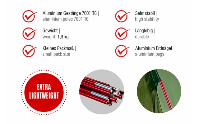 Die extra leichten und stabilen Aluminium ErdnĂ€gel verankern das Zelt sicher im Boden. Bei extrem harten Böden kann man mittels der groĂen Bodenschlaufen das Zelt mit Steinen befestigen. Das AuĂenzelt ist aus hochwertigem Polyester mit 3000 mm Polyurethan (PU) Beschichtung, nahtversiegelt und wasserdicht. Das Einfachdachzelt ist aufgrund seiner Konstruktion von einer Person schnell und mĂŒhelos aufzubauen.