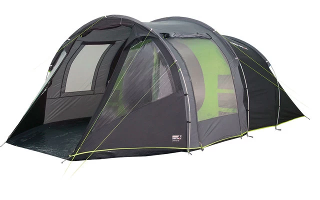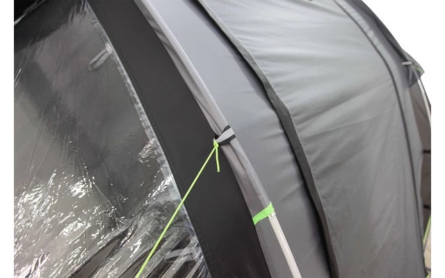 Familien-Tunnelzelt in Stehhöhe. Der groĂe Vorbau mit Gaze-SeitentĂŒr und Gazefenster kann optimal belĂŒftet werden und bietet reichlich Platz fĂŒr die CampingausrĂŒstung und Aufenthalt bei schlechtem Wetter. Klarsichtfolienfenster bringen das Tageslicht in die Wohnung und die Gardinen schĂŒtzen vor neugierigen Blicken. Der pflegeleichte Zeltboden, am Innenzelt angenĂ€ht, kann sich nicht verschieben. Die Faulstreifen halten Schmutz und Feuchtigkeit ab. 3 Dauerventilationen belĂŒften das Zelt bei jeder Wetterlage optimal und mĂŒssen immer geöffnet sein. Das Zelt hat extra starke ReiĂverschlĂŒsse und reflektierende Abspannschlaufen fĂŒr mehr Sicherheit. Die sehr stabilen 5 mm Durchmesser Stahl-ErdnĂ€gel verbiegen sich auch bei hartem Untergrund nicht. FĂŒr die Abspannung werden spezielle 5 mm Stahl- ErdnĂ€gel mit Haken fĂŒr besseren Halt der Spannleinen geliefert. Die ReiĂverschluss âAbdeckung ist mit einer zusĂ€tzlichen Regenrinne ausgestattet.