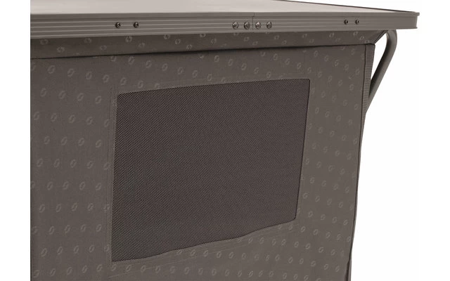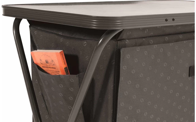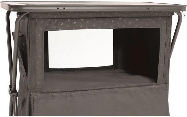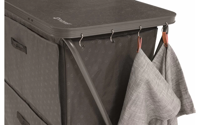 Praktisch, leicht aufzubauender Schrank mit einem AluminiumgestĂ€nge, welches fĂŒr hervorragende StabilitĂ€t sorgt. Die robuste, herunterklappbare TĂŒr mit Griff bietet einen gerĂ€uscharmen nutzbaren Stauraum wie zu Hause. In der TĂŒr ist ein Magnetverschluss eingearbeitet. Der Schrank beinhaltet zwei groĂe FĂ€cher, wo Sie ihre Utensilien unterbringen können. Ebenso befindet sich an der Seite eine Organiser-Tasche fĂŒr zusĂ€tzlichen Stauraum. An seitlichen Haken lassen sich ohne Probleme mehrere HandtĂŒcher oder Ă€hnliches, anbringen.
