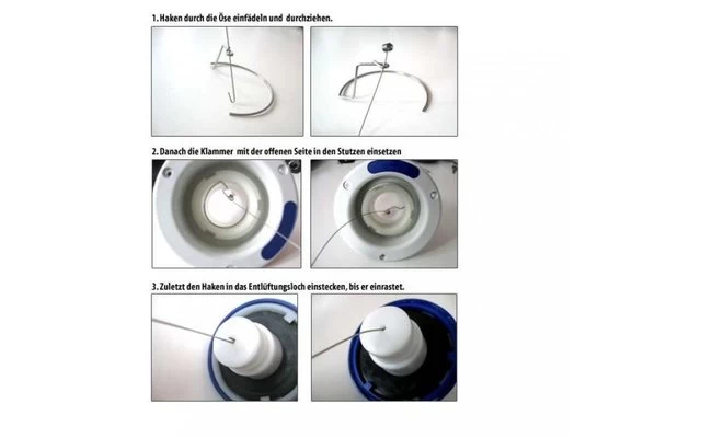 Haken durch die Ăse einfĂ€deln und durchziehen. Die Klammer mit der offenen Seite in den Stutzen einsetzen. Zuletzt den Haken in das EntlĂŒftungsloch einstecken, bis dieser einrastet.