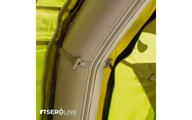 Ein lichtreflektierendes Material innerhalb der Schlafkabine sorgt fĂŒr ungestörten Schlaf. Die abgewinkelte Balkenkonstruktion bietet sowohl verbesserte WindstabilitĂ€t als auch angenehme Stehhöhe im gesamten Zelt.
