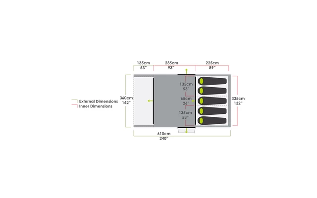 Ein groĂer Wohnbereich, bis zu 2 Schlafzimmer und ein geschĂŒtztes Vorzelt bieten Platz zum Entspannen im Zelt und zum Organisieren der AusrĂŒstung.